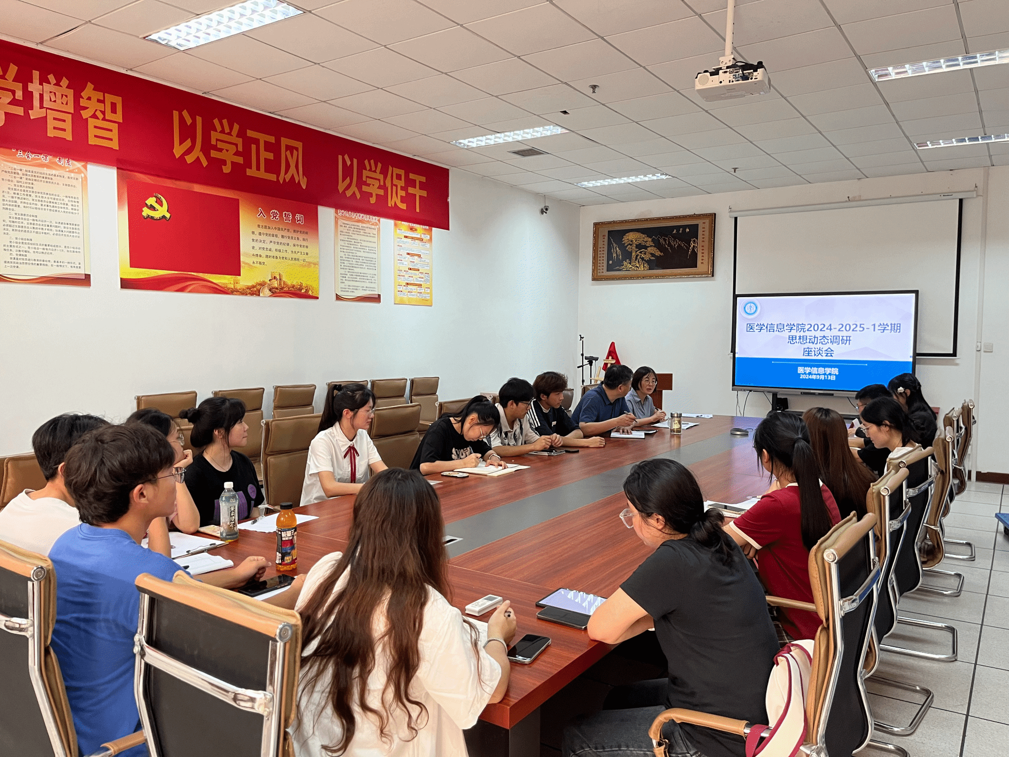 9月14日中午,学院在会议室召开思想动态调研座谈会,各年级学生代表和辅导员参加会议,会议由王颖主持。会上,王颖首先传达了学校开展思想调研工作的会议精神,介绍了本次调研会的目的和主题。参会学生围绕假期见闻、社会实践、社会热点和学习现状等多方面进行发言,交流了在日常生活、专业课学习、职业规划、就业考研等方面的疑惑和建议。座谈会现场气氛活跃,同学们畅所欲言。